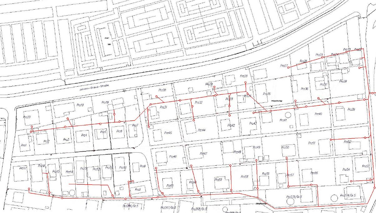 Der unten dargestellte Plan zeigt den Verlauf des Abwasserkanals. Es wurden ausschließlich die Hauptrohre des Abwasserkanals eingezeichnet. Der Kanalverlauf wurde aus dem alten händisch erstellten Planwerk unserer Vereinsleitung in das aktuelle geografische GIS übernommen.
